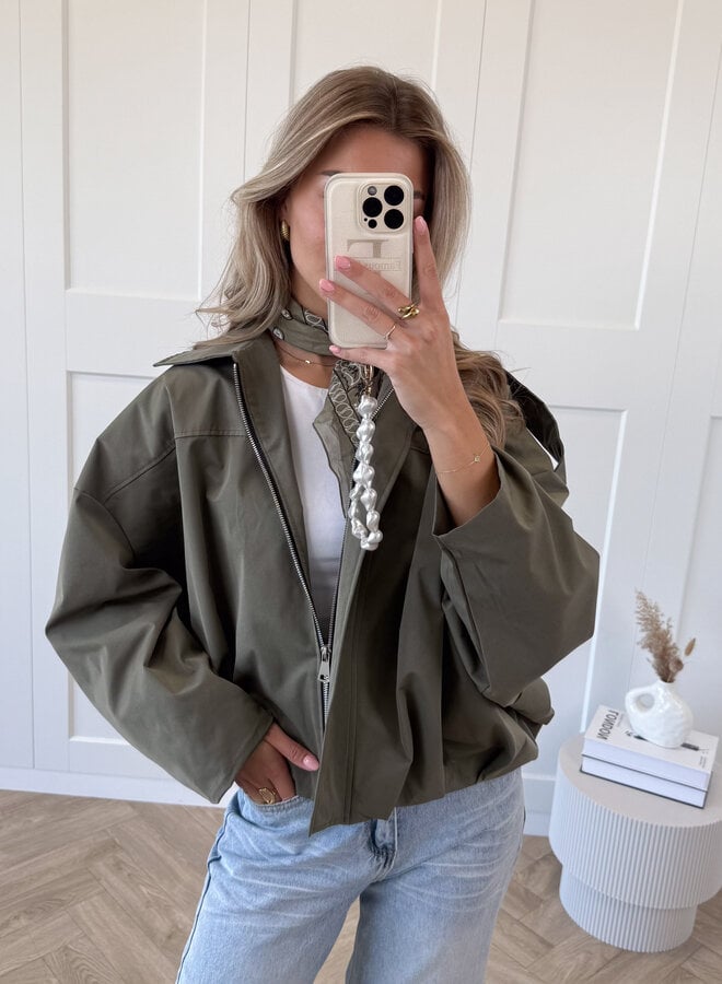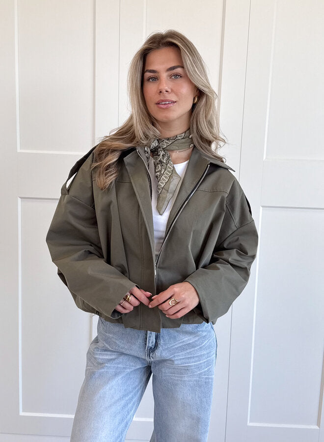 An oversized khaki zip jacket with a boxy silhouette and laid-back vibe – perfect for effortless everyday layering. Model is wearing size M - UK10.