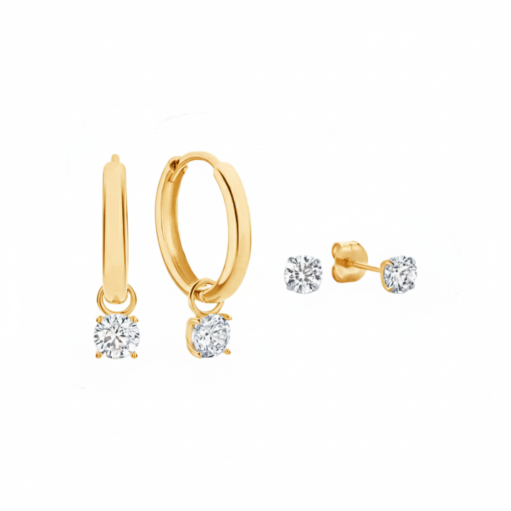 The Larmes de Lune earrings set features luminous adorned with shimmering moon-inspired stones. With multiple designs in one set, it offers versatility for both everyday elegance and special occasions.