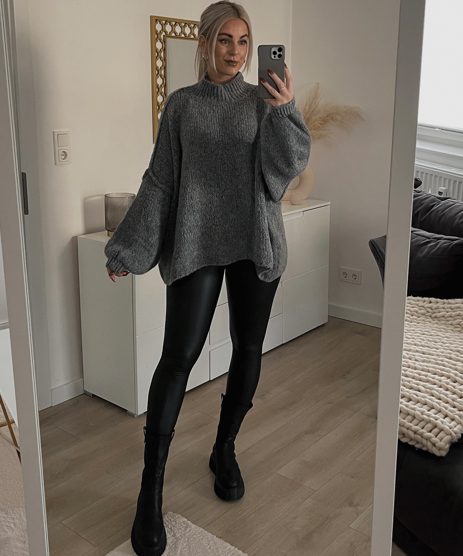 An oversized grey knit jumper with a cosy high neck and soft, slouchy fit – perfect for layering over dresses or styling with denim. Model is wearing size M - UK10.