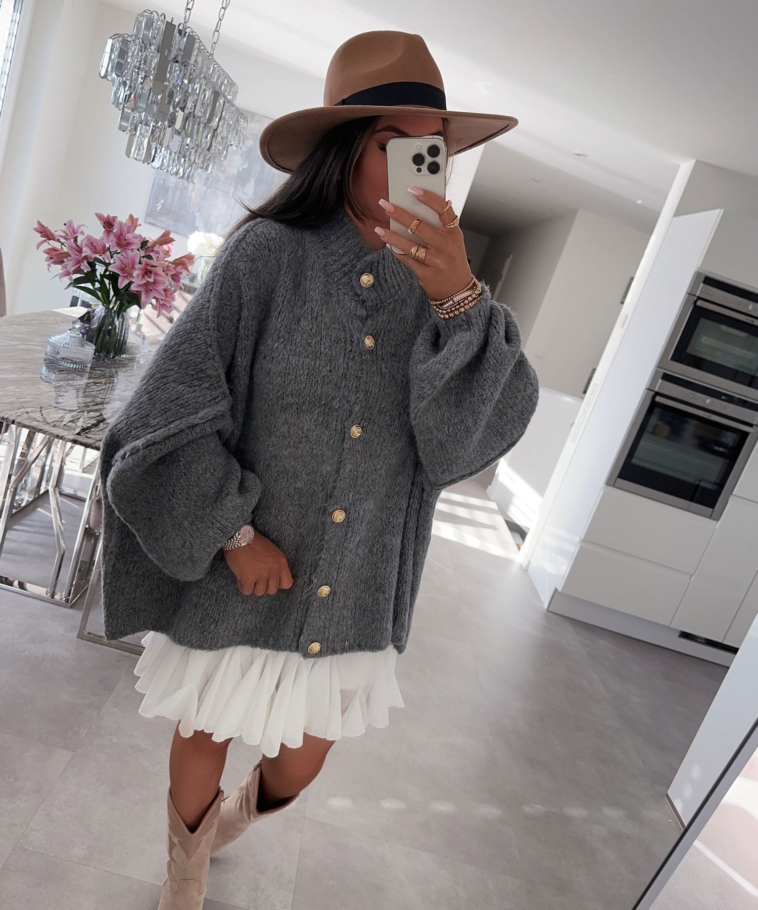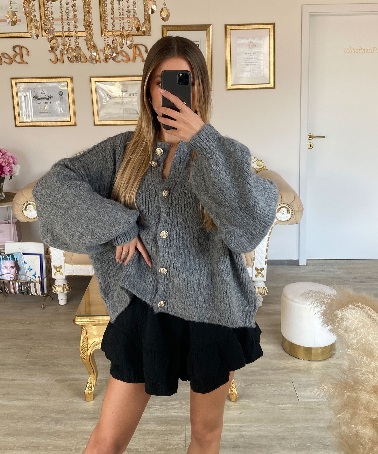 The perfect piece to stay stylish and cosy through winter. Beautiful knit cardigan with elegant gold buttons in an oversized look, made from an extremely soft fabric — model is 165 cm and wears size M - UK 10.