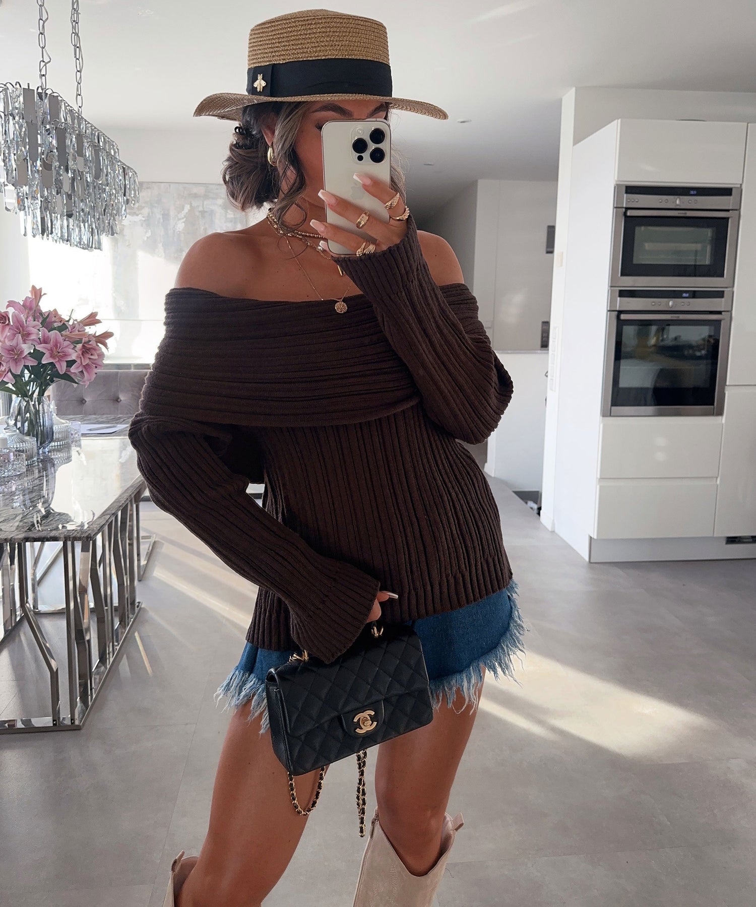 Wrap yourself in understated elegance with the Chocolate Pullover. Designed with an off-shoulder cut and rich brown tone, it brings a chic yet cozy vibe — the perfect knit for both relaxed days and elevated evenings. True to size — model is 5'5" and wears size M - UK10.