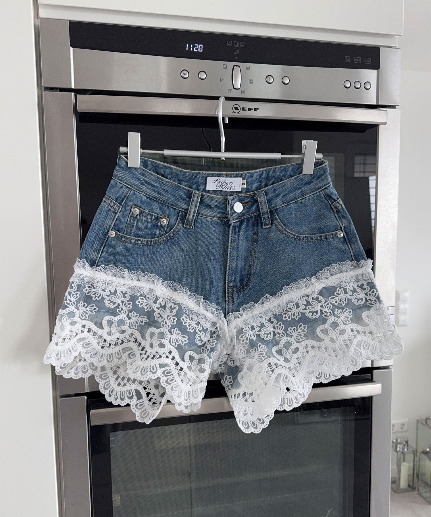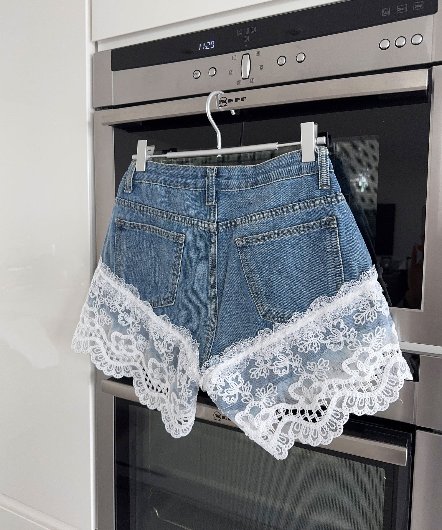 Fabric: Light-wash denim with lace trim for a feminine touch