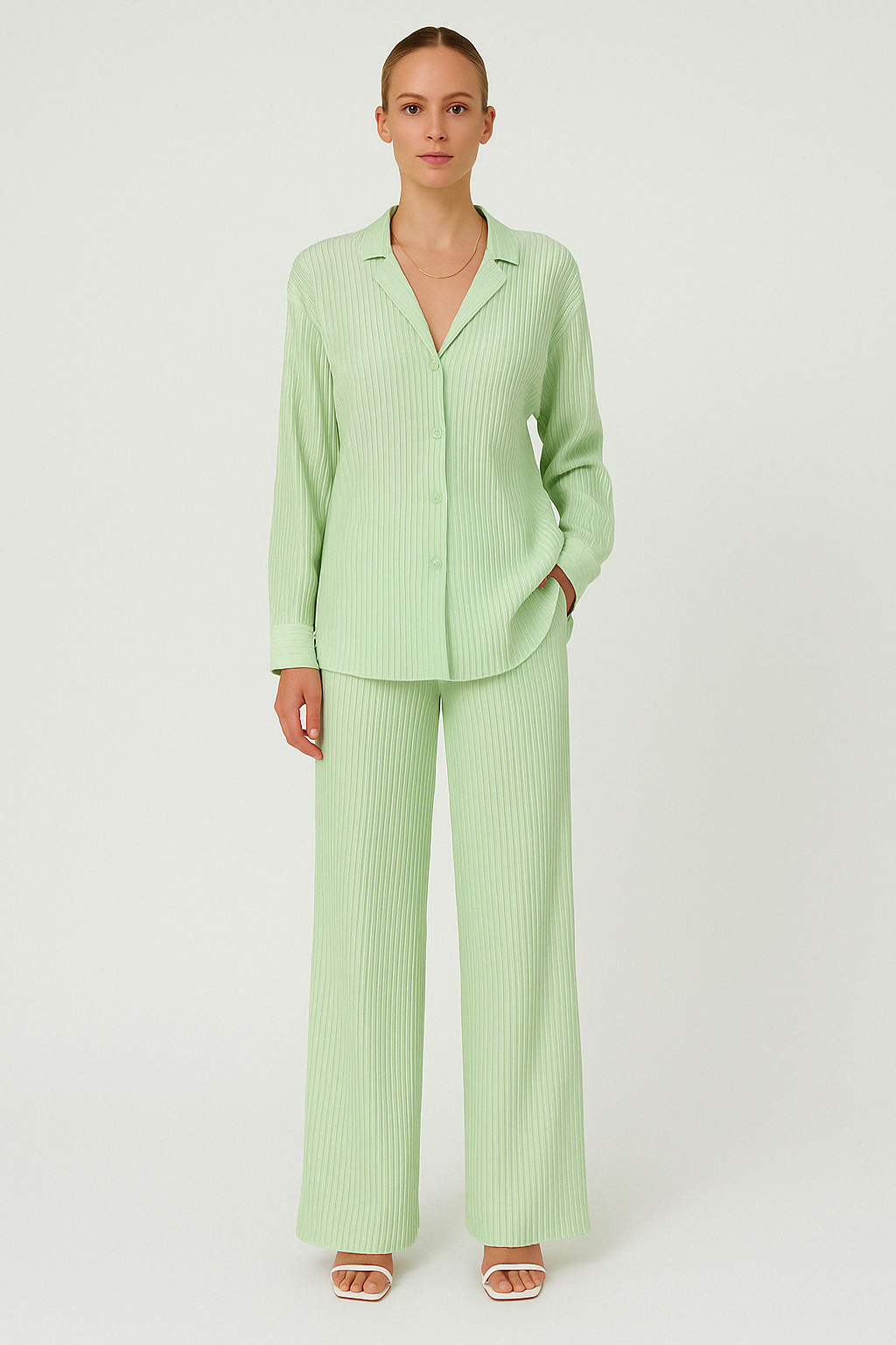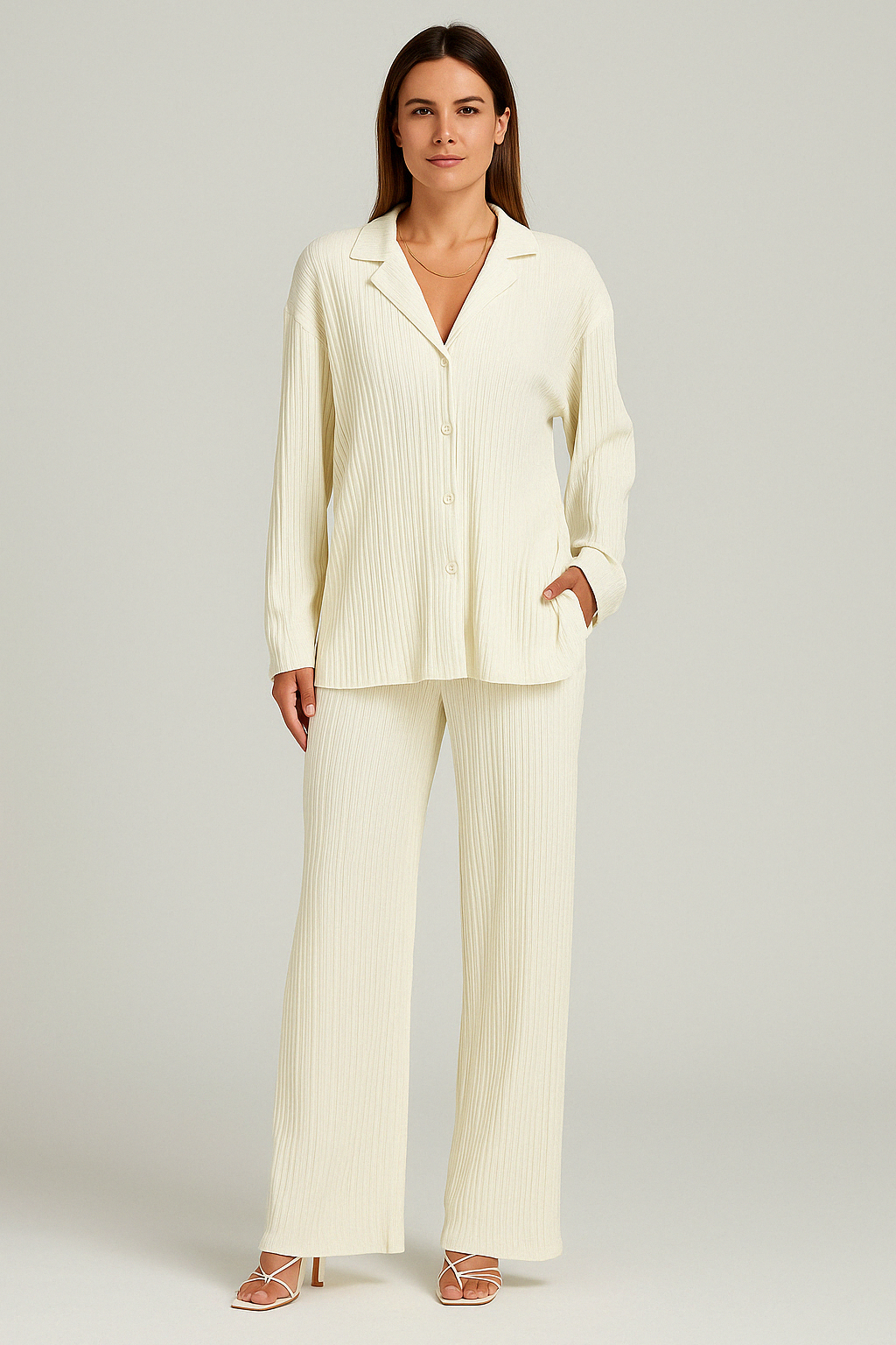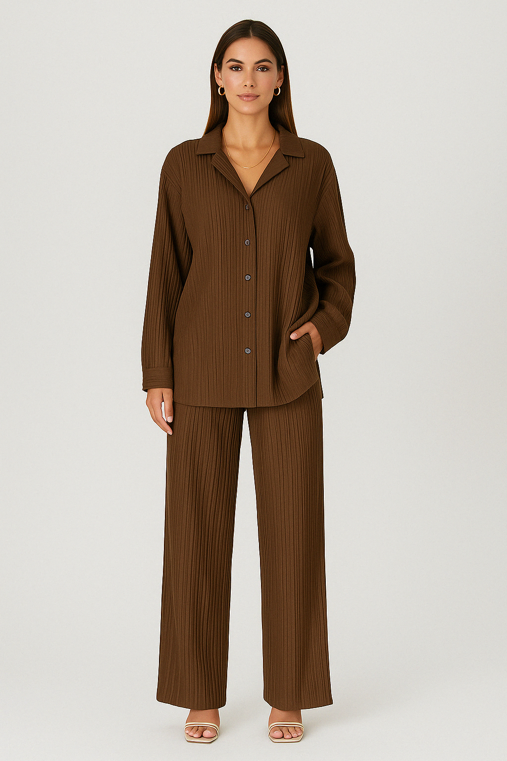 The Maya Set is the perfect balance of chic and cozy, designed for effortless styling. The set includes a fitted, high-neck top with long sleeves, complemented by matching pleated wide-leg pants that move gracefully with every step. Crafted from soft, breathable fabric, this set offers both sophistication and comfort. Whether you're dressing up for a brunch date or relaxing at home, Maya delivers timeless elegance that fits every occasion.